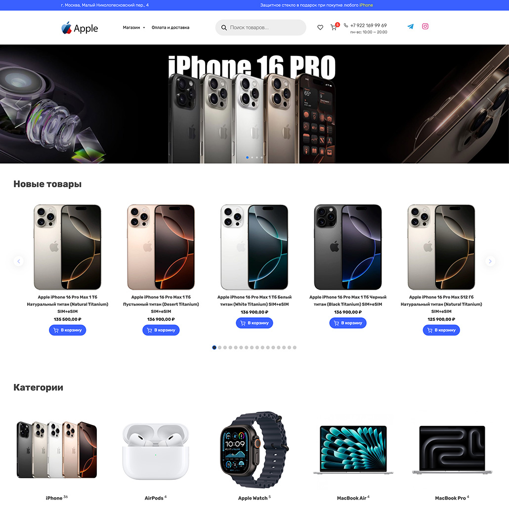 Готовый интернет-магазин техники Apple — это комплексное решение, позволяющее быстро запустить онлайн-продажи оригинальных устройств Apple без лишних затрат на разработку и наполнение сайта.